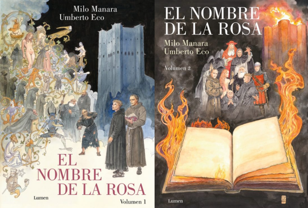 Otra maravilla que me llamó la atención. Dos volúmenes lanzados por la Editorial Lumen en cómic, del mítico libro «El Nombre de la Rosa» escrito por Umberto Eco, y dibujados por Milo Manara (sí, ese Milo Manara que tanto nos enamoró con «El Clic» -obra maestra del cómic erótico-. Y claro, habíendome leído de pequeño el citado libro, volver a leerlo en cómic….no podía dejarlo pasar.
